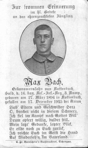 Max Bach - Binz geb.: 27.03.1894, Rottenbuch gef.: 17.12.1915, Arras (Frankreich) Grabstätte: Fournes-en-Weppes (Block 7, Grab 107)
