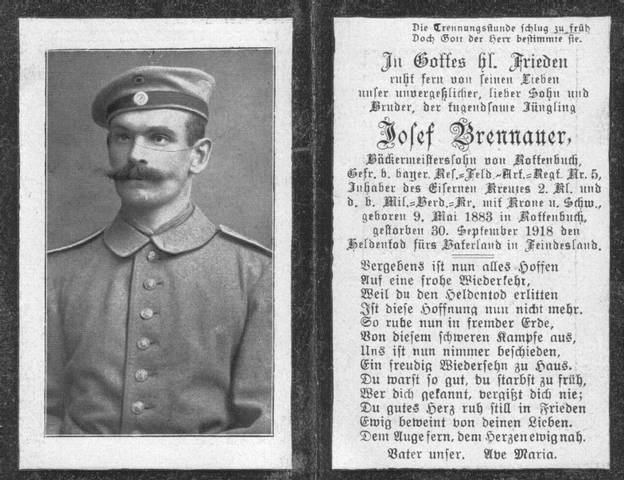 Josef Brennauer geb.: 09.05.1883, Rottenbuch gef.: 29.09.1918, Lothringen (Frankreich) Grabstätte: Consenvoye (Block 2, Grab 254)