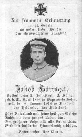 Jakob Häringer - Feldbader geb.: 21.04.1896, Bayerniederhofen gef.: 06.01.1918, Bukarest (Rumänien) Grabstätte: ?