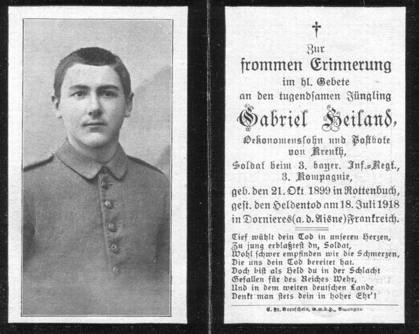 Gabriel Heiland - Kreuthbauer geb.: 21.10.1899, Rottenbuch gef.: 18.07.1918, Missy aux Bois (Frankreich) Grabstätte: Vauxbuin