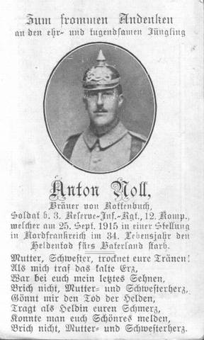 Anton Noll geb.: 1882 gef.: 25.09.1915, bei Arras (Frankreich) Grabstätte: Saint-Laurent-Blangy