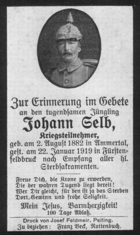Johann Selb geb.: 02.08.1882, Ammertal gef.: 22.01.1919, Fürstenfeldbruck (Oberbayern) Grabstätte: ?