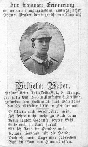 Wilhelm Weber geb.: 15.10.1895 Neufahrn b. Freising gef.: 28.10.1916 Grabstätte: ?