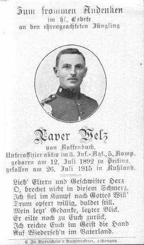 Xaver Welz - Bichelebeck geb.: 12.07.1892 - Peiting gef.: 26.07.1915 - (Rußland) Grabstätte: ?