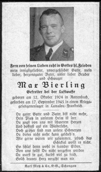 Max Bierling geb.: 12.10.1904, Rottenbuch gef.: 17.09.1945, Kriegsgefangenenlager Lamalou (Frankreich) Grabstätte: Dagneux (Block 35 Reihe 12 Grab 400)