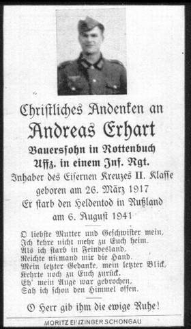 Andreas Erhart geb.: 26.03.1917 gef.: 06.08.1941, Ganowka Grabstätte: Tscherikow - Belarus