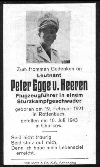 Peter Egge von Heeren geb.: 12.02.1921, Rottenbuch gef.: 10.07.1943, Warwarowka (Ukraine) Grabstätte: Charkow (Block 10, Reihe 10, Grab 1120)