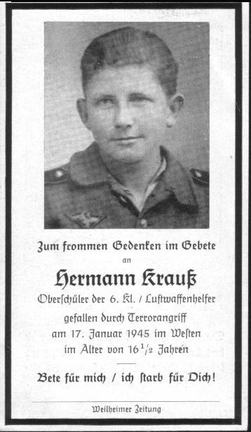 Hermann Krauß geb.: 08.06.1928, München gef.: 17.01.1945, Herborn, Reservelazarett Grabstätte: Mit 16½ Jahren jüngster Gefallener Rottenbuch's.
