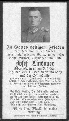 Josef Lindauer geb.: 21.06.1903, Rottenbuch gef.: 17.02.1944, Nettuno (Italien) Grabstätte: Pomezia (Block B, Grab 1467)
