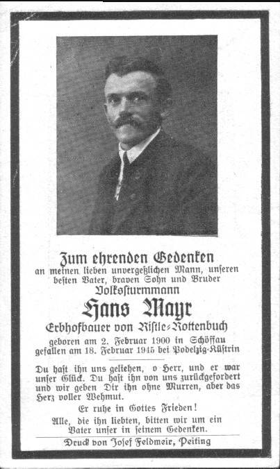 Johann Mayr - Ristle geb.: 02.02.1900, Schöffau gef.: 18.02.1945, Reitwein (Brandenburg) Grabstätte: Podelzig