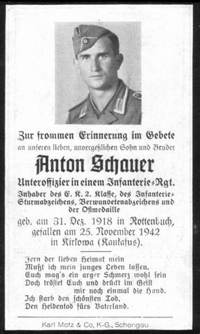 Anton Schauer geb.: 31.12.1918, Rottenbuch gef.: 25.11.1942, Kirkova (Kaukasus - Russland) Grabstätte: Im Gedenkbuch von Krasnodar - Apscheronsk