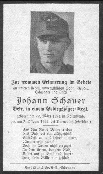 Johann Schauer - Reiswies geb.: 22.03.1924, Rottenbuch gef.: 07.10.1944, bei Bolewatsch (Serbien) Grabstätte: