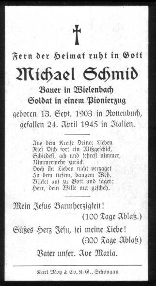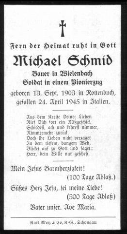 Michael Schmid - Mundus geb.: 13.09.1903, Rottenbuch gef.: 24.04.1945, Costermano (Italien) Grabstätte: Costermano (Block 12, Grab 1287)