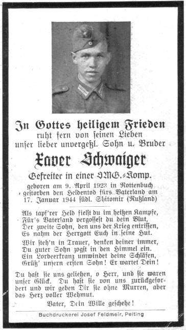 Xaver Schwaiger - Bichelebeck geb.: 09.04.1923, Rottenbuch gef.: 17.01.1944, Kochanowka (Ukraine) Grabstätte: Kiew, Block 8 Reihe 15 Grab 1303