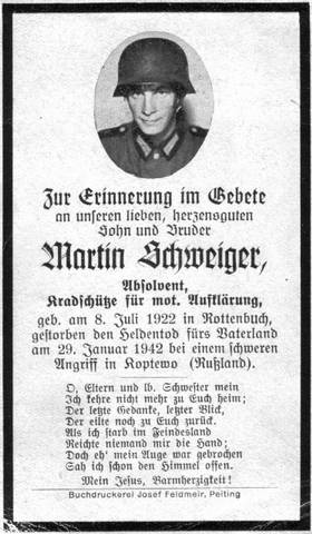Martin Schweiger geb.: 08.07.1922, Rottenbuch gef.: 29.01.1942, Koptewo (Russland) Grabstätte: Kursk - Besedino (Rußland), Block 5 - Unter den Unbekannten