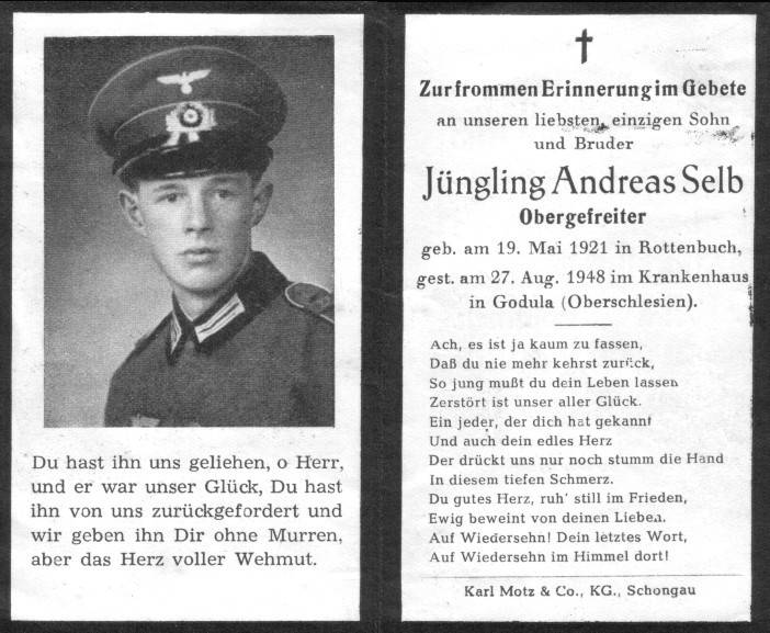 Andreas Selb geb.: 19.05.1921, Rottenbuch gef.: 27.08.1948, Kgf.Lg.Laz. Godula/Krs. Kattowitz Oberschlesien (Polen) Grabstätte: Ruda Slaska Godula