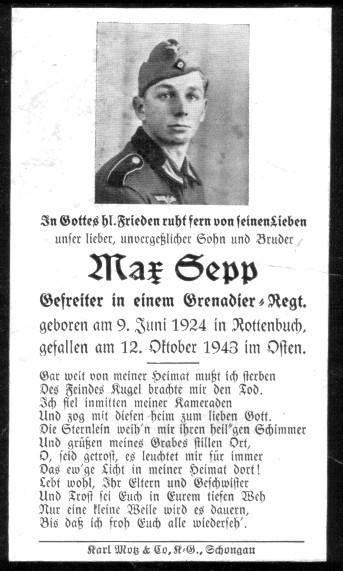 Max Sepp geb.: 09.06.1924 gef.: 12.10.1943, östl. der Dnjepr Abschnitt Süd (Ukraine) Grabstätte: Tuderod nahe Sverda (30km südl. Gumel) ???