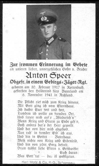Anton Speer - Achenspeer geb.: 20.02.1917, Rottenbuch gef.: 06.11.1941, Diakova (Ukraine) Grabstätte: