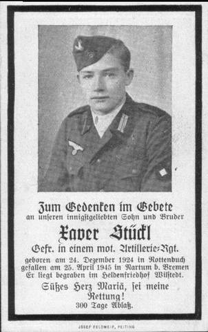 Franz Xaver Stückl geb.: 24.12.1924, Rottenbuch gef.: 25.04.1945, Nartum b. Bremen Grabstätte: Gyhum, Kreis Rothenburg/Wümme (Grab 110)