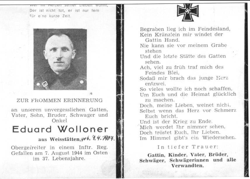 Eduard Wolloner geb.: 07.04.1907, Weißstätten gef.: 07.08.1944, bei Bardauskai, Vilkaviškio (Litauen) Grabstätte: